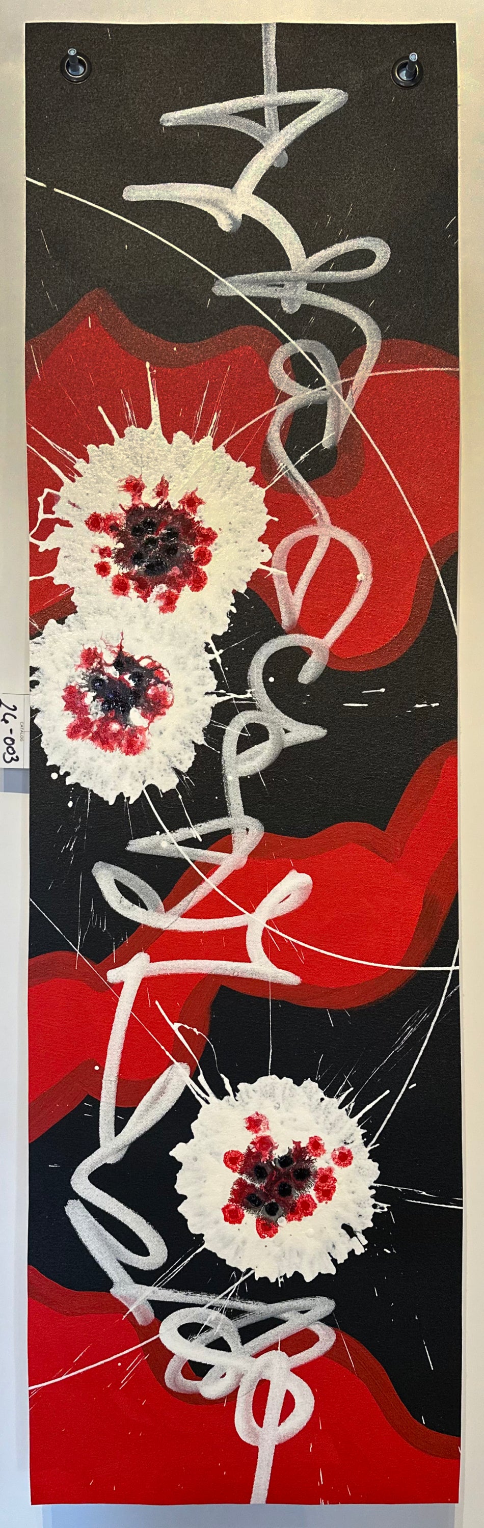 - Painted on unstretched free-hanging canvas.